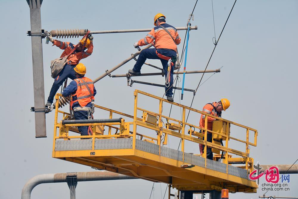 4月4日,中铁电气化局运管公司上海维管处南京维管段接触网工对长江大桥供电设备进行检修、维护。杜希昊摄