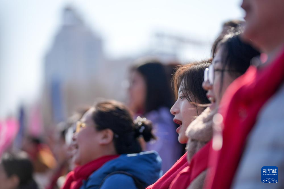 4月9日,市民在“喊江节”现场高喊“开江啦”。