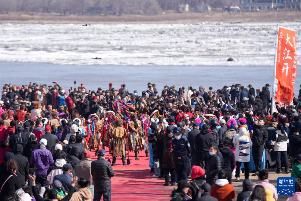 4月9日,市民在“喊江节”现场观看赫哲族开江祈福仪式。
