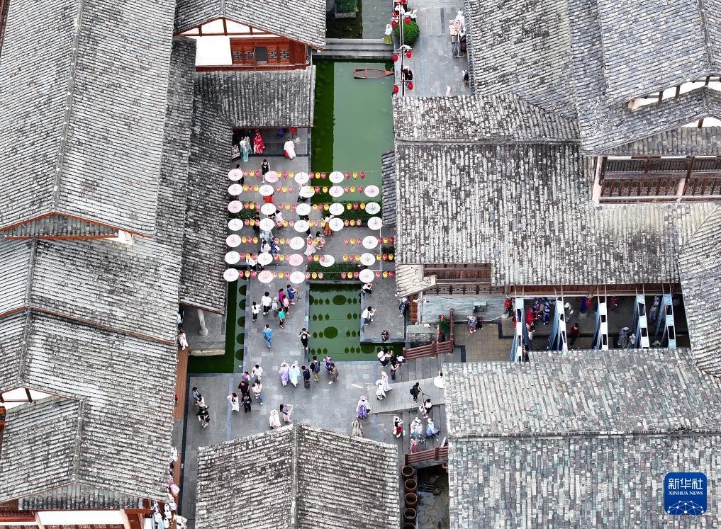 4月12日,人们在广西南宁市相思小镇游览(无人机照片)。