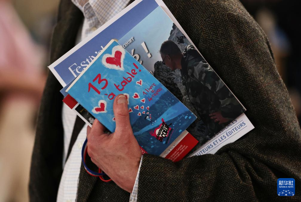 4月12日,一名参观者在法国巴黎临时大皇宫举行的2024巴黎书展上手持书刊。