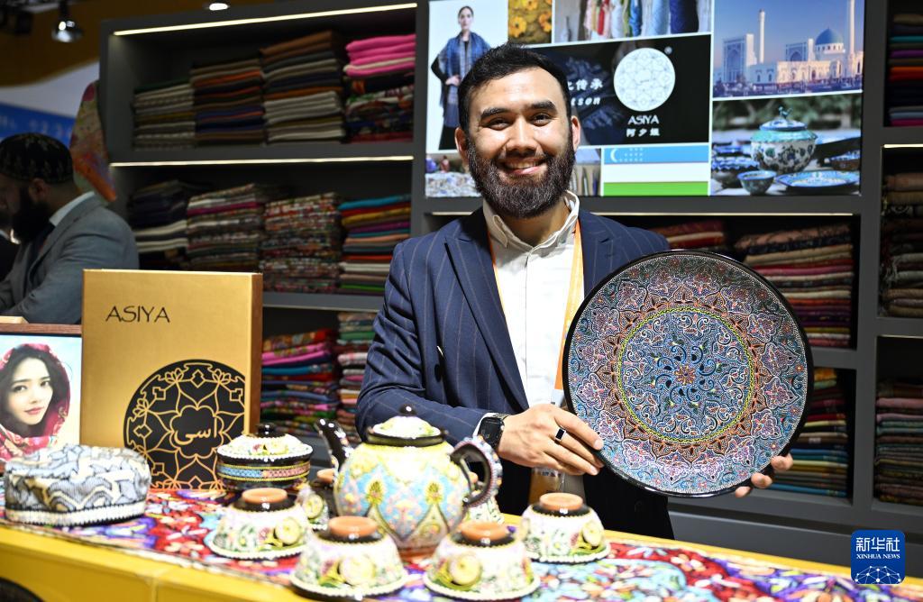4月13日,一名乌兹别克斯坦展商在展示手工陶瓷盘。