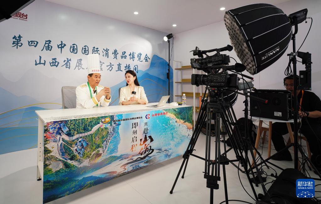 4月13日,在消博会山西省展台官方直播间,晋菜厨师王力群(左)通过直播推介山西美食。