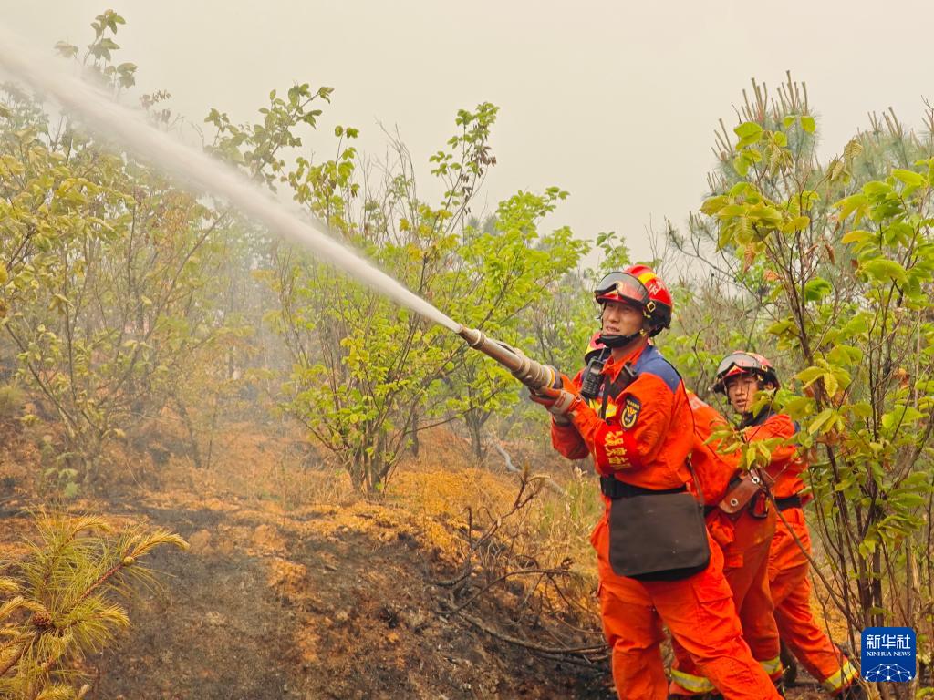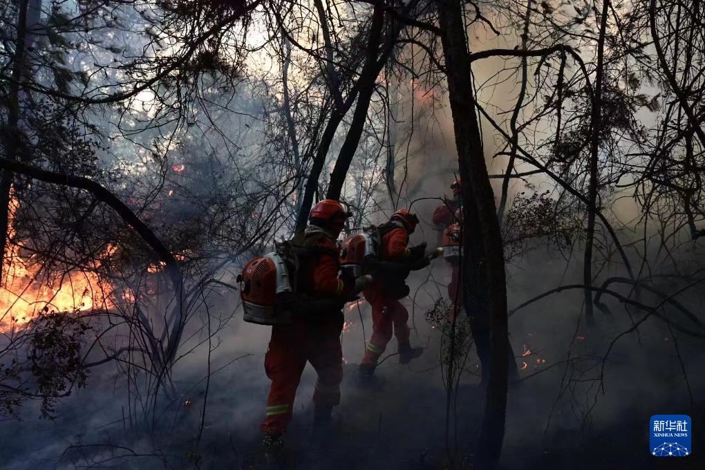 4月14日,消防救援人员在云南晋宁森林火灾现场扑救。新华社发