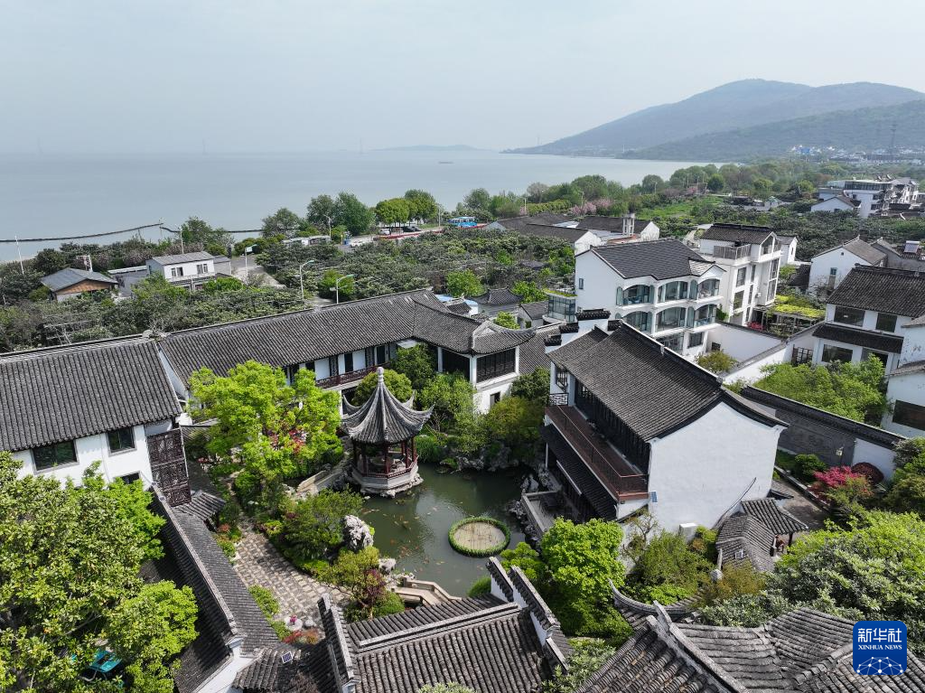 4月11日拍摄的苏州市吴中区东山镇太湖畔的仁德山庄民宿(无人机照片)。