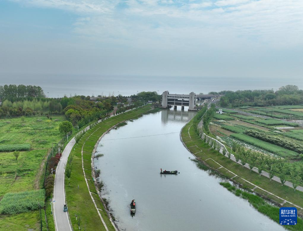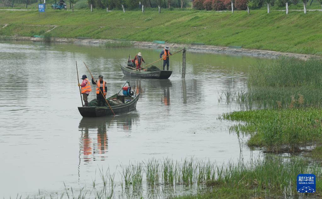 4月11日,河道保洁员在位于浙江湖州的太湖罗溇港沿岸清理非法捕鱼地笼网(无人机照片)。太湖溇港是具有两千多年历史的世界灌溉工程遗产,近年来政府通过对太湖溇港持续拓宽、疏浚和治理,使太湖主要入湖口断面水质连续多年保持在Ⅲ类及以上水平。