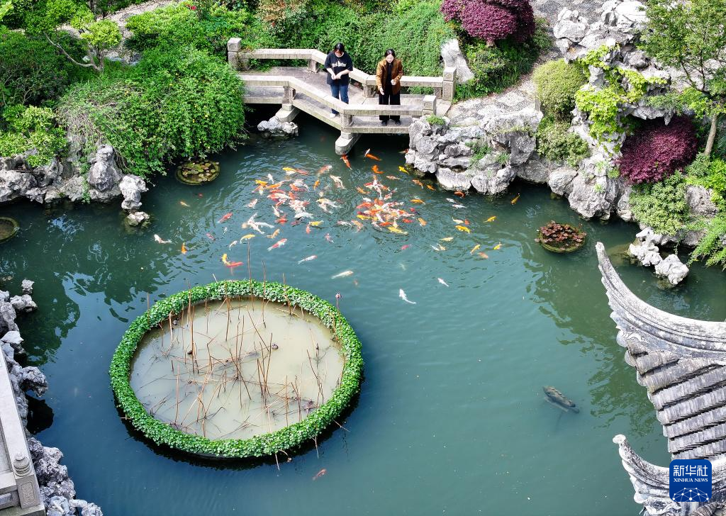 4月11日,苏州市吴中区东山镇太湖畔的仁德山庄民宿主人陈婷(右)在喂鱼。陈婷2018年辞去苏州市区银行工作,回乡利用自家院落经营民宿。美丽的太湖景色、园林式的建筑风格,加上政策的支持,让陈婷民宿事业越做越好。