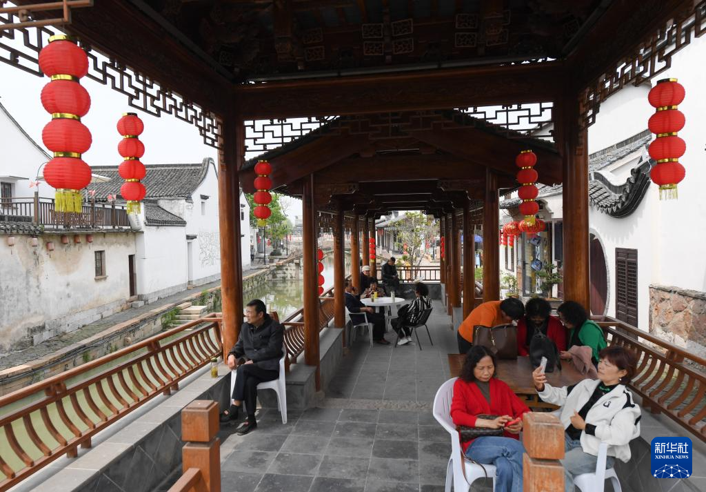 4月11日,人们在浙江湖州义皋村一处水岸的游廊内休憩。湖州市吴兴区利用滨湖风光秀美的天然优势,全力打造有太湖溇港文化特色的美丽乡村示范带,目前区域内24个行政村已全部创建成为“美丽乡村”。