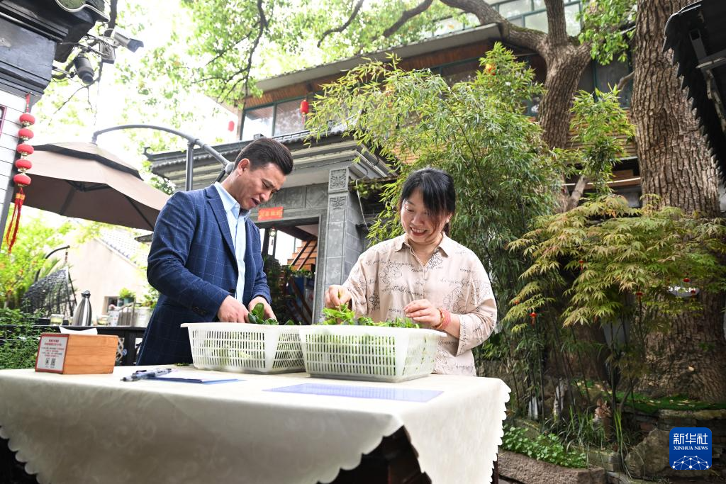 4月11日,在苏州市吴中区金庭镇,退捕渔民沈雪荣和妻子沈燕燕在自家经营的农家乐“美味渔家蟹园”择菜。从沈雪荣祖父开始,一家人便以在太湖上捕鱼为生。“那时候渔民很苦,我长大后赶上国家的好政策,通过养大闸蟹、开农家乐,改变了生活。退捕后,太湖的生态环境越来越好,游客越来越多,我们家的农家乐生意也越来越红火。”沈雪荣感慨道。