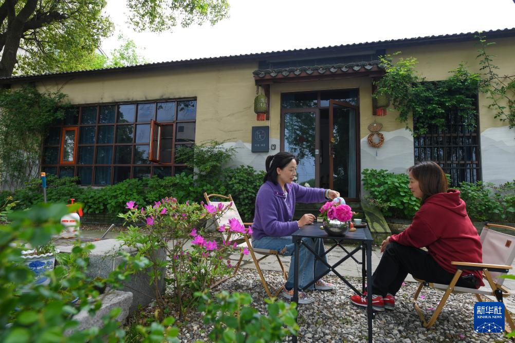 4月11日,在织里镇庙兜村,民宿主李会玲(左)在由猪羊圈和柴房改建的民宿和客人喝茶。湖州市吴兴区利用滨湖风光秀美的天然优势,全力打造有太湖溇港文化特色的美丽乡村示范带,目前区域内24个行政村已全部创建成为“美丽乡村”。