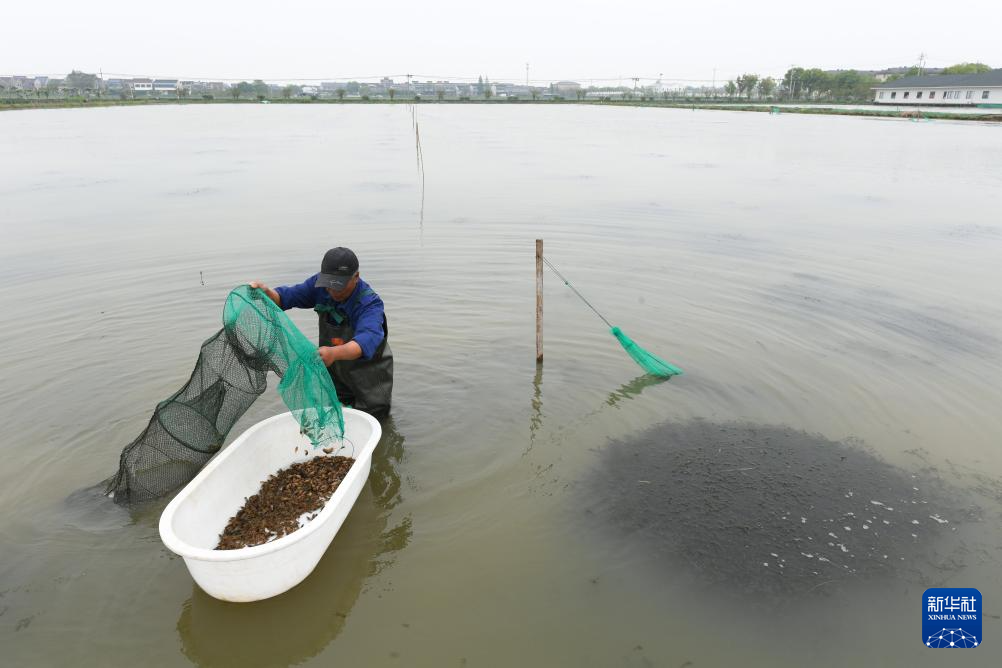 4月11日,浙江湖州许溇村村民在虾塘捕捞小龙虾苗,成熟的小龙虾将于5月集中上市。许溇村近年来通过发展枇杷种植和小龙虾养殖打响水乡游品牌,为村民增收。