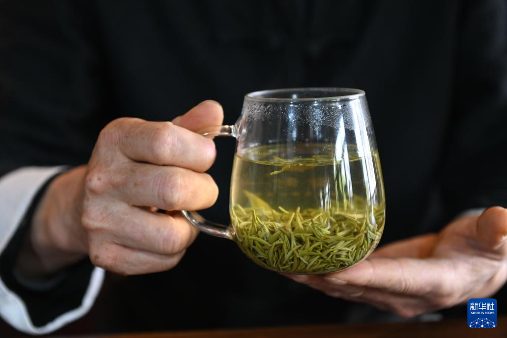 4月11日,在苏州市吴中区东山镇,苏州市碧螺春制作技艺非物质文化遗产代表性传承人严介龙在展示冲泡的新茶。