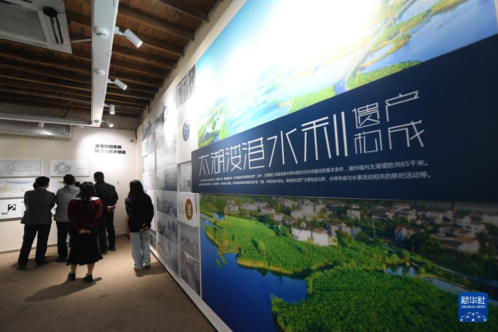 4月11日,游客在浙江湖州义皋村太湖溇港文化展示馆了解溇港圩田系统。太湖溇港是具有两千多年历史的世界灌溉工程遗产,近年来政府通过对太湖溇港持续拓宽、疏浚和治理,使太湖主要入湖口断面水质连续多年保持在Ⅲ类及以上水平。