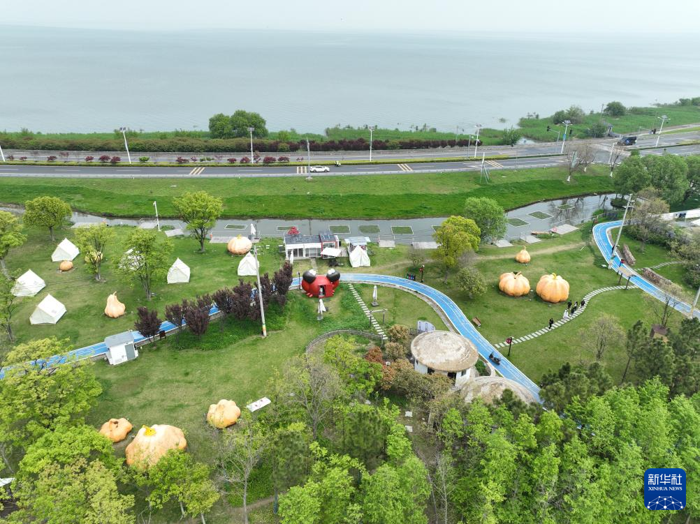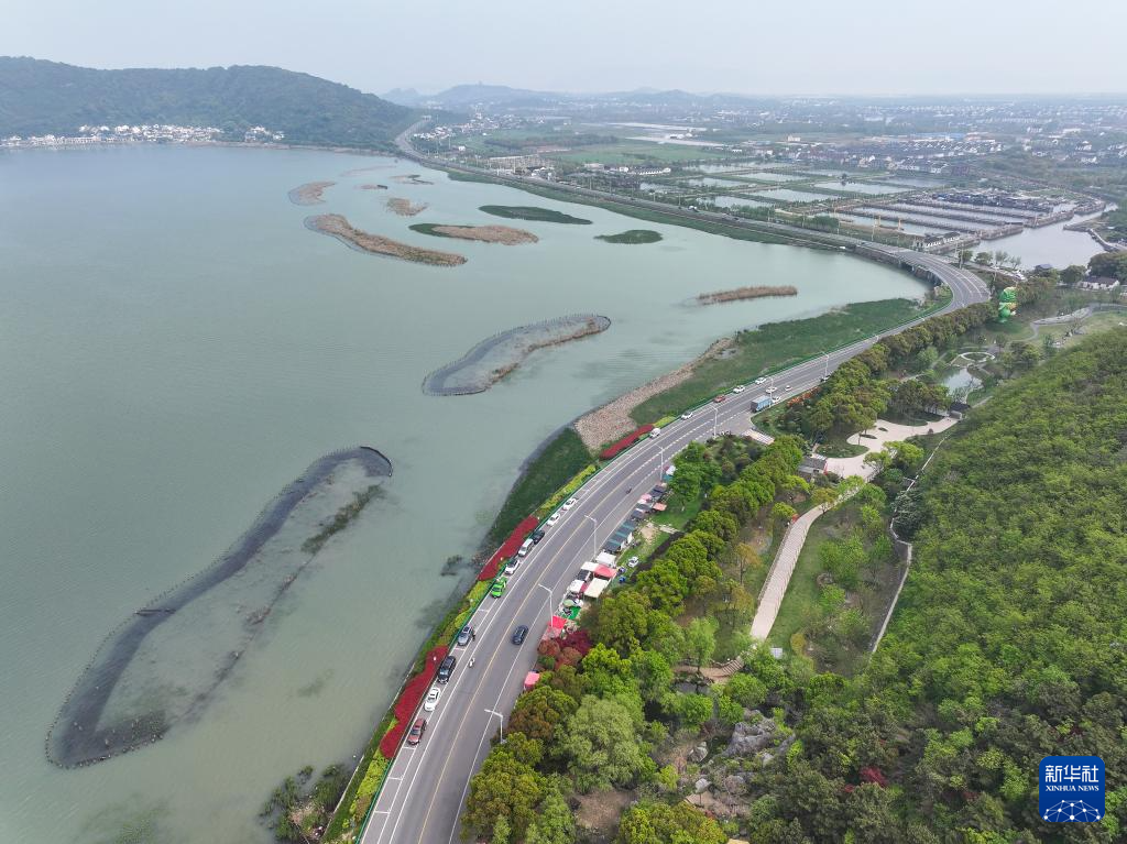 4月11日拍摄的苏州市吴中区金庭镇环太湖湿地带修复项目(无人机照片)。