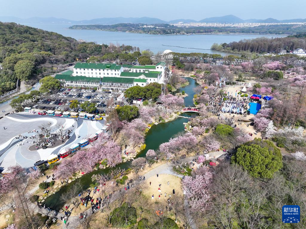 3月21日,游客在无锡太湖鼋头渚景区赏樱(无人机照片)。