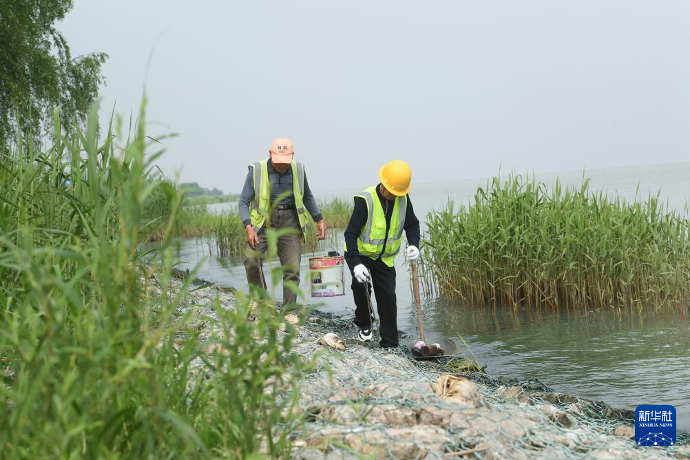 4月11日,河道保洁员在位于浙江湖州的太湖沿岸清理垃圾。