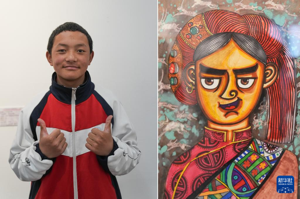4月19日拍摄的拉萨市特殊教育学校15岁的听障学生多杰占堆和他的作品《哥的头像》(拼版照片)。