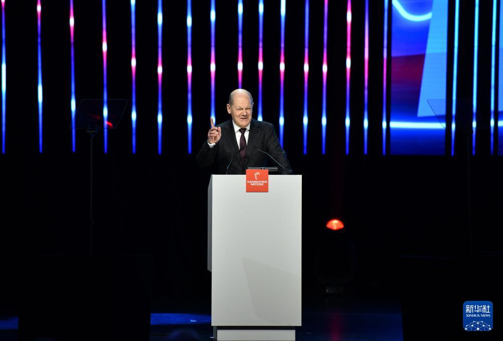 4月21日,德国总理朔尔茨在德国汉诺威工业博览会开幕式上致辞。