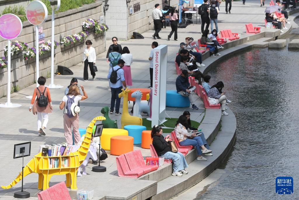 4月19日,人们在韩国首尔市的清溪川边的露天图书馆读书、休闲。