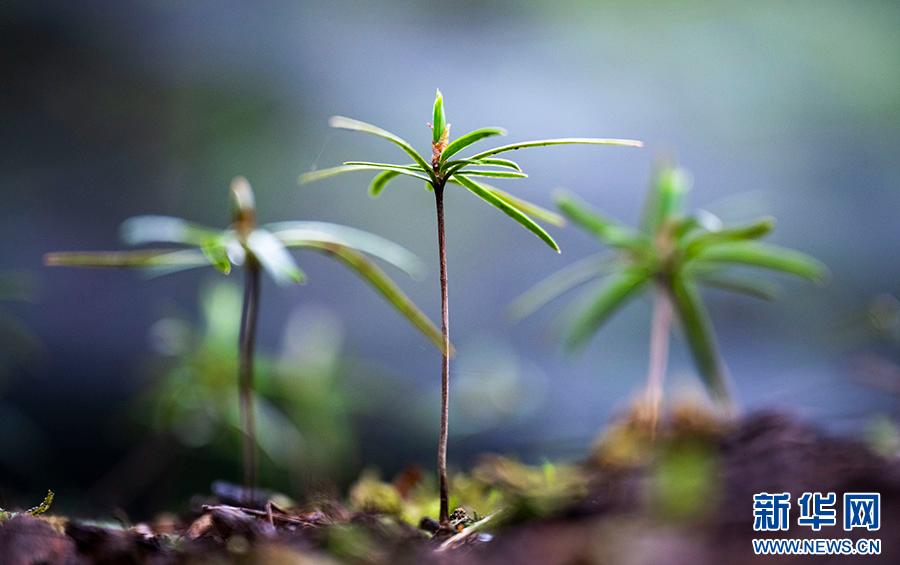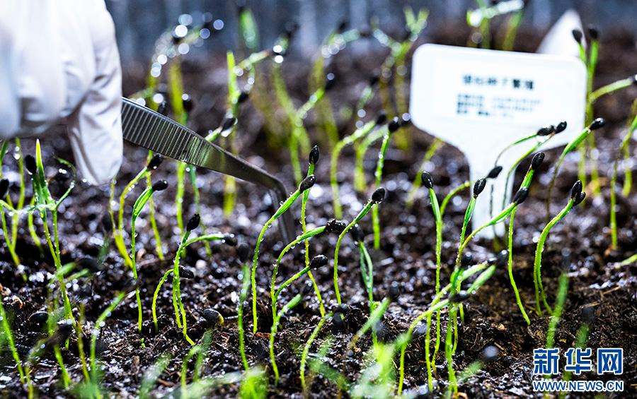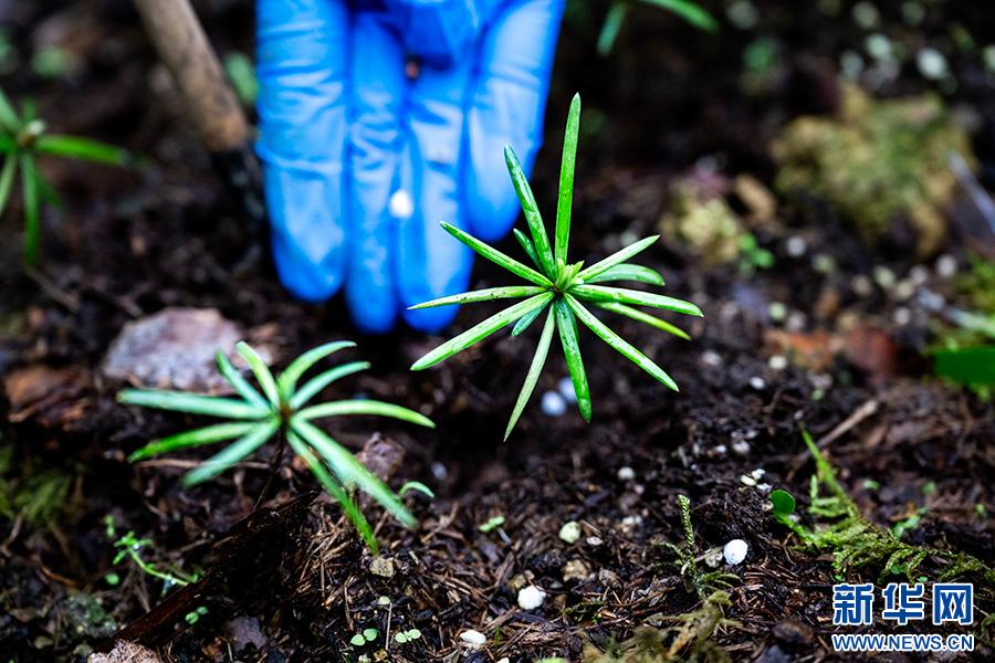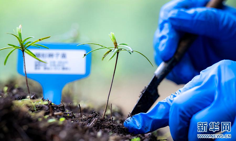 研究人员正在检查银杉种子的出苗情况。新华网发(甘昊旻 摄)