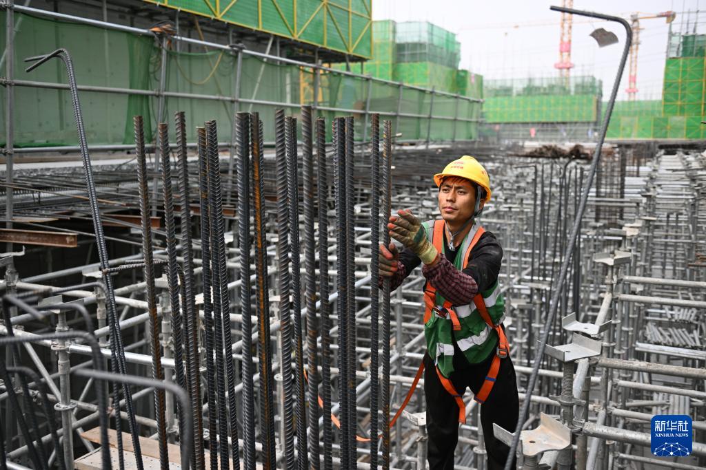 4月22日,中铁十二局工人在河北雄安新区大河片区安置房及配套设施项目建设现场捆绑钢筋。