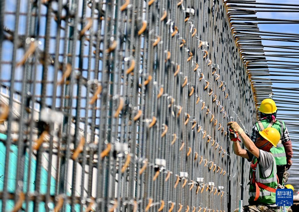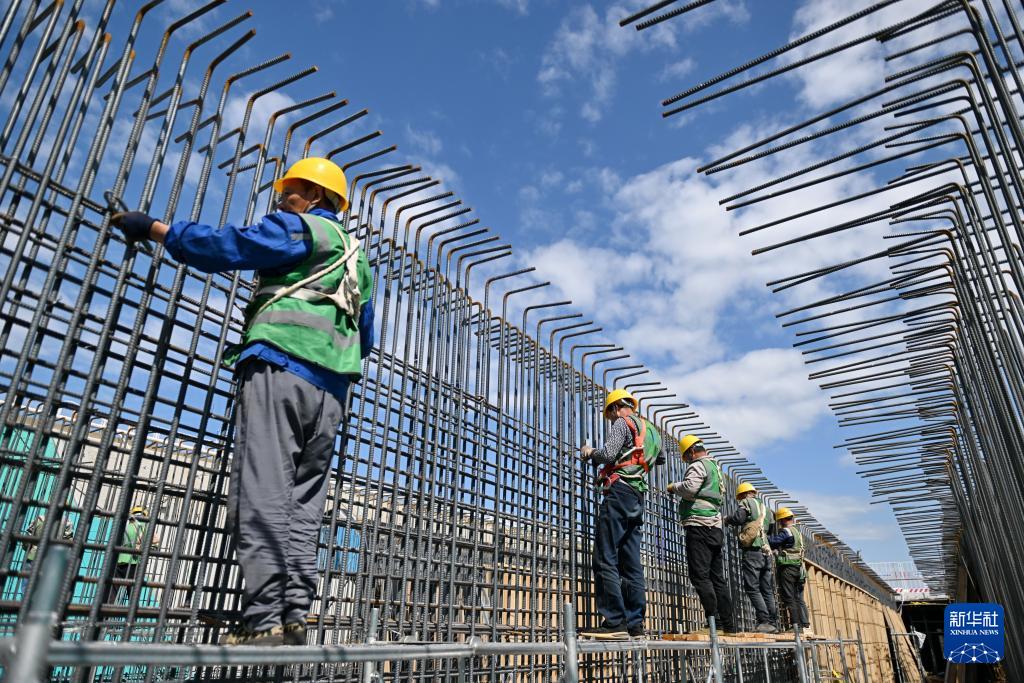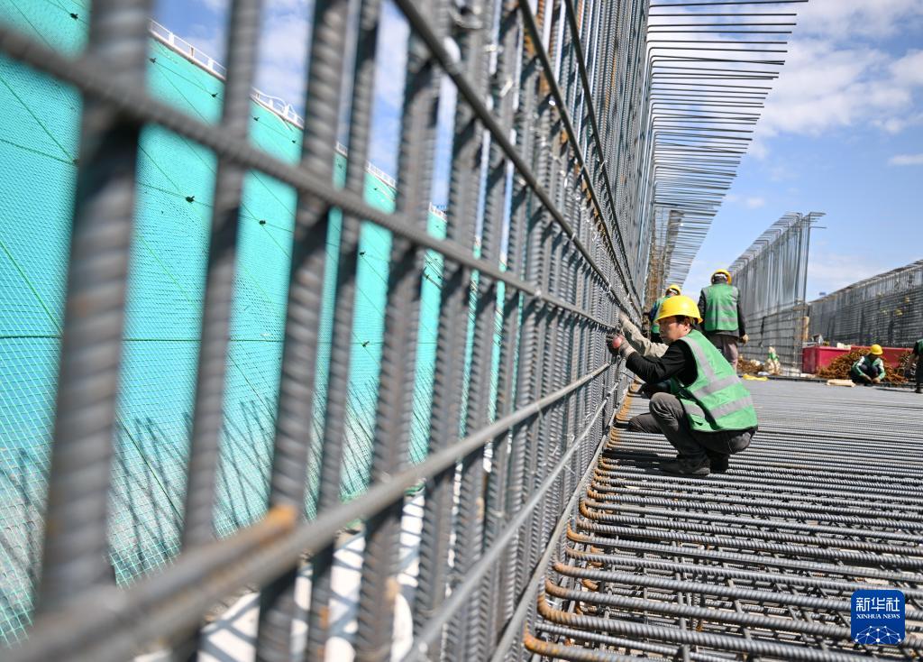 4月23日,中铁四局工人在雄安新区起步区NA12市政道路和综合管廊(二期)项目建设现场捆绑钢筋。