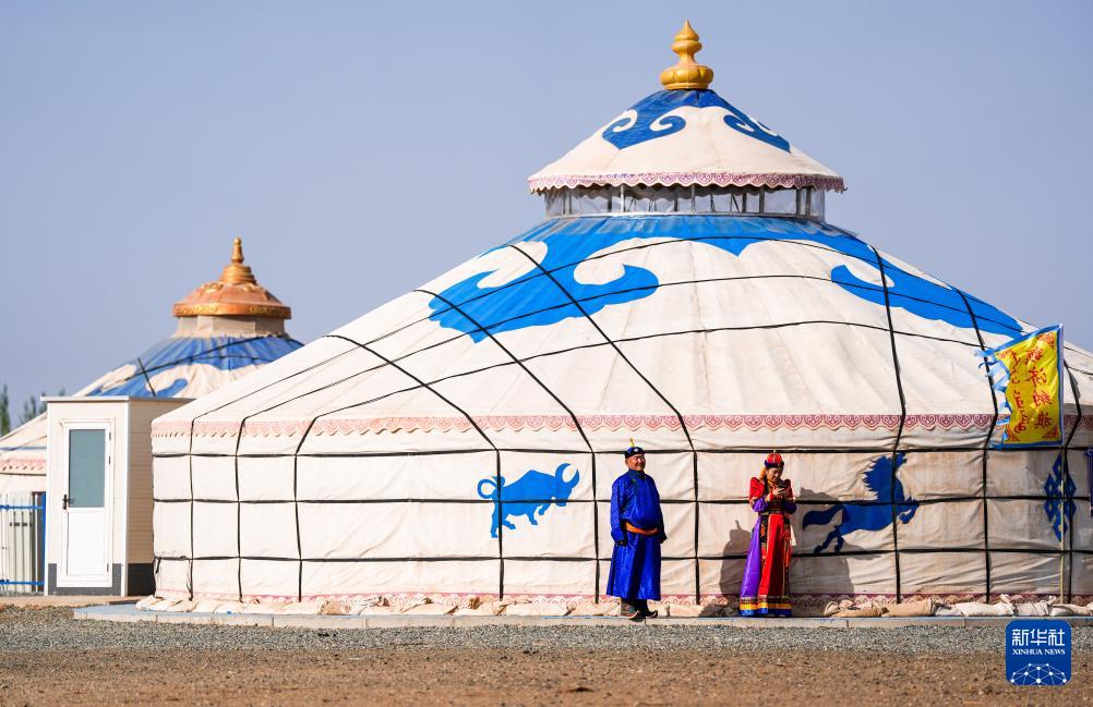 4月25日,两位观众在蒙古包前观看文艺表演。