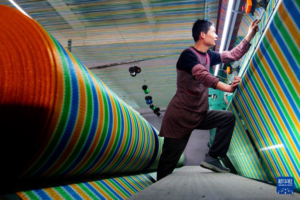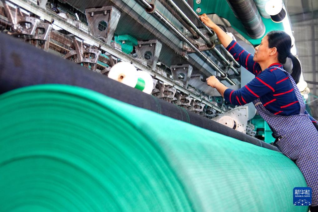 4月25日,在惠民县李庄镇一家绳网企业,工作人员在织机前值守。