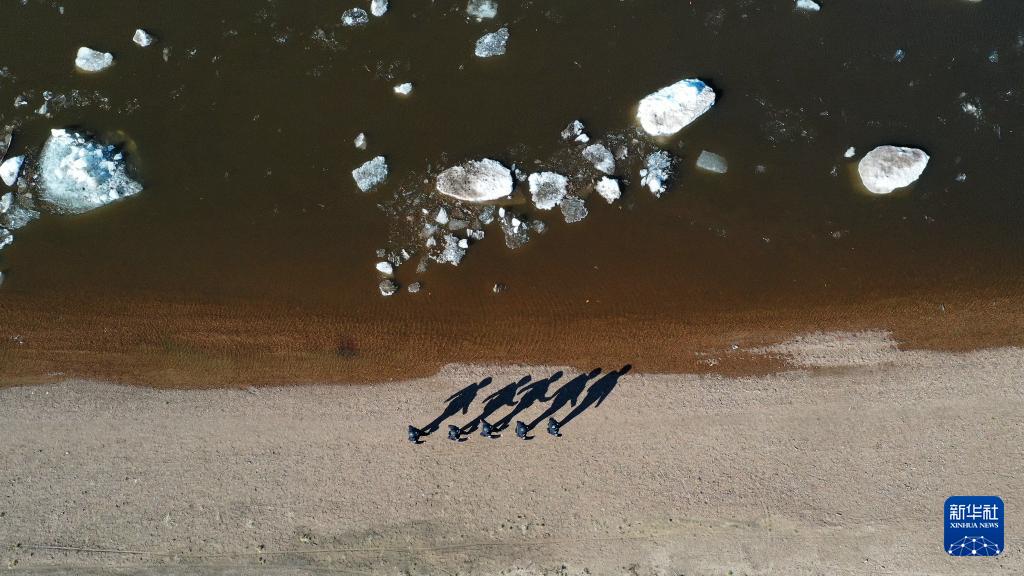 4月26日,黑龙江出入境边防检查总站黑河边境管理支队花园边境派出所民警在黑龙江黑河段江岸巡逻(无人机照片)。