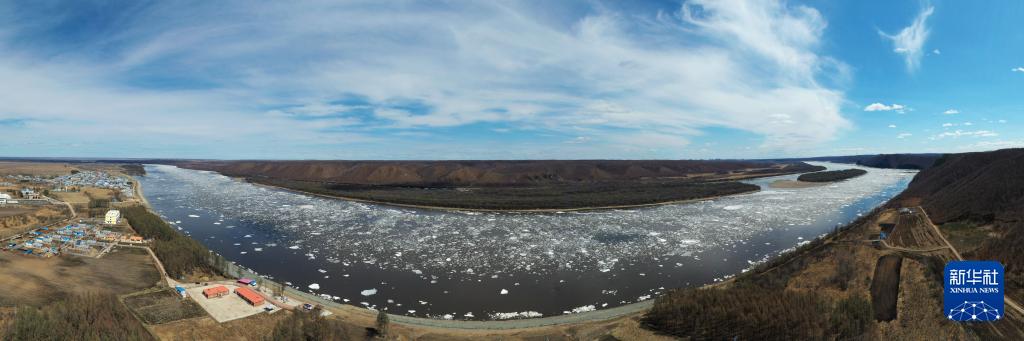 这是4月26日拍摄的黑龙江黑河段“跑冰排”景象(无人机全景照片)。