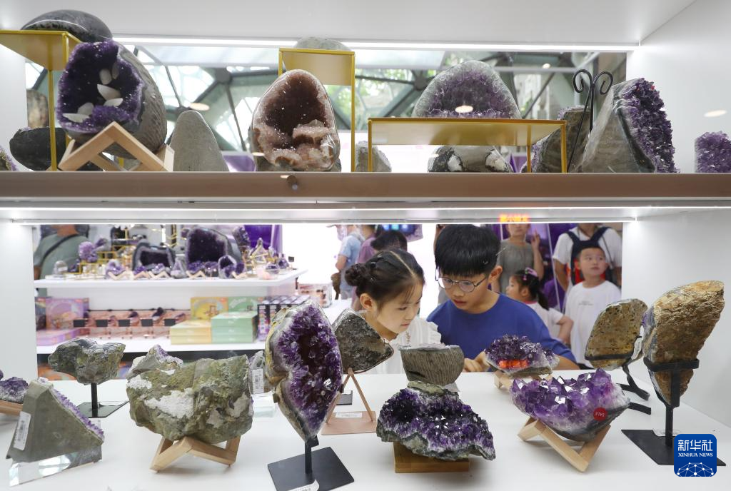 7月16日,两名小朋友在纪念品商店内一组紫水晶摆件前驻足观看。
