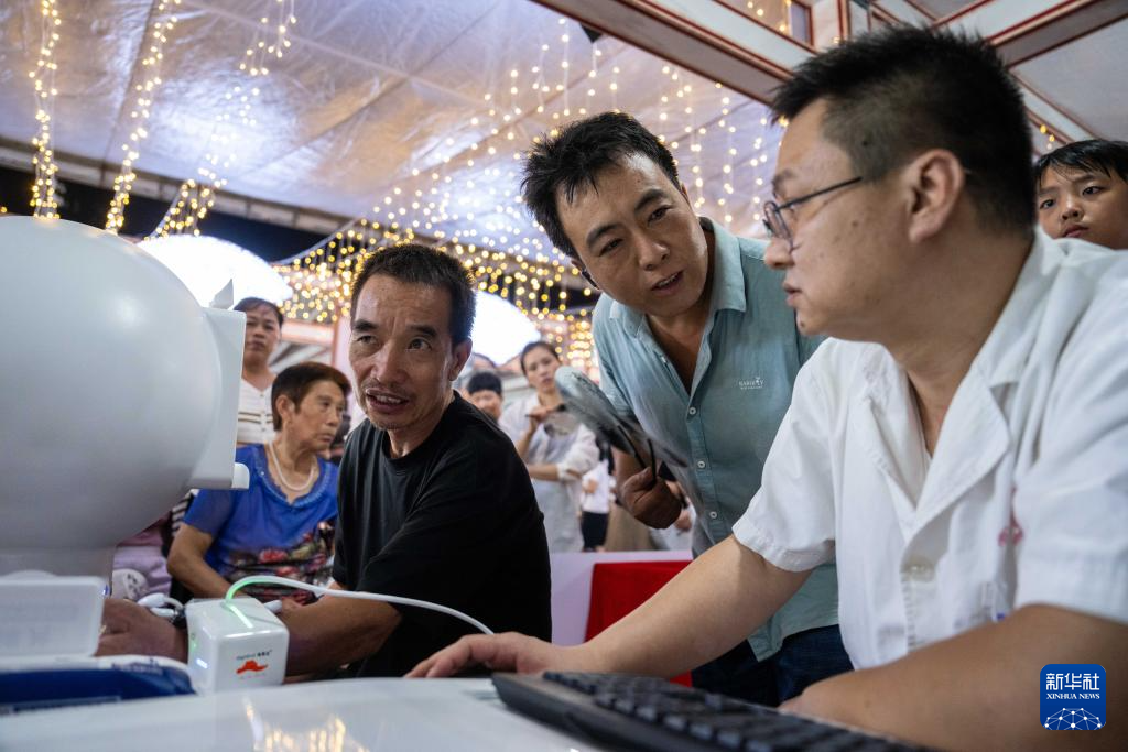 8月13日,在常宁市南门湖广场,医护人员(右三)为市民进行电子诊脉。