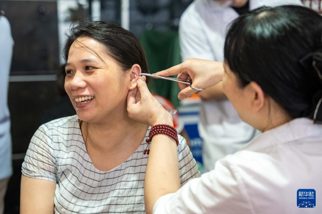 8月13日,在常宁市南门湖广场,医护人员(右)为市民贴耳贴。