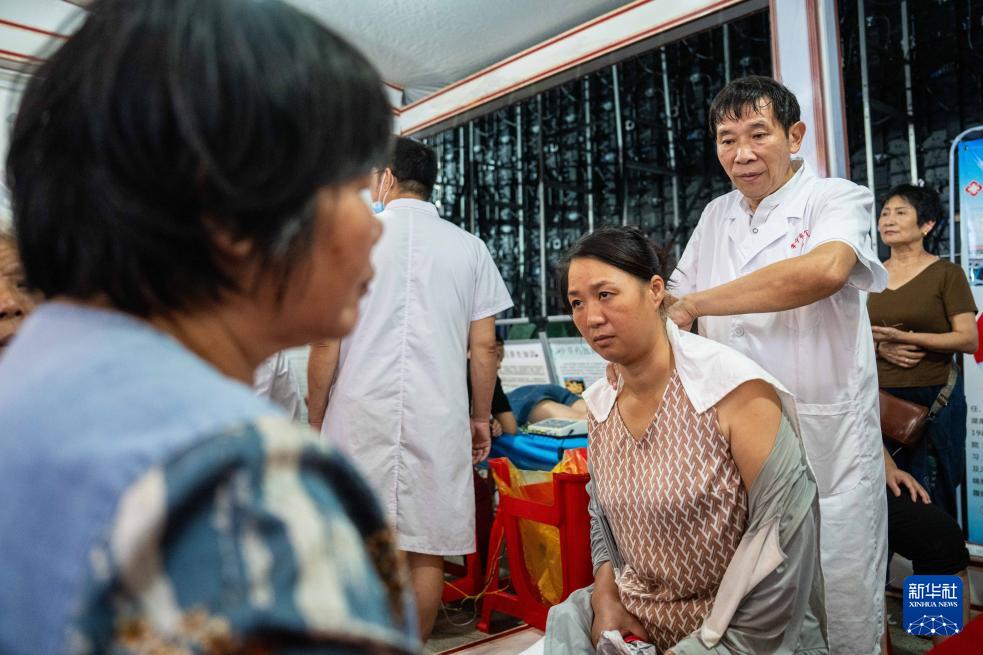 8月13日,在常宁市南门湖广场,医护人员(右)为市民做针灸。