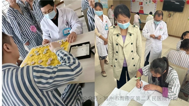 同时,南康区第二人民医院精神科病区医护患者联欢活动在户外活动室举行。医护人员和患者组队玩游戏、做身体健康操、包饺子等,现场气氛热烈,活动形式多样。大家一边玩游戏、下象棋、绘画、一边品尝美食,喜悦的心情表露无遗。