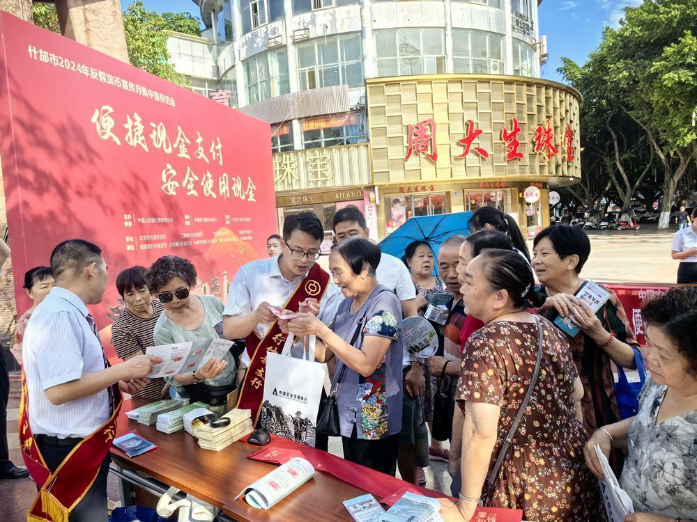 为进一步提升人民群众防范假币意识和识别假币的能力,筑牢反假货币防线,营造良好的人民币流通环境。近日,由中国人民银行德阳市分行主办,中国银行德阳什邡支行(以下简称“什邡中行”)牵头承办的什邡市2024年反假货币宣传月集中宣传活动在什邡市小广场开展,什邡市公安局方亭派出所、农发行什邡支行等单位参与了此次活动。