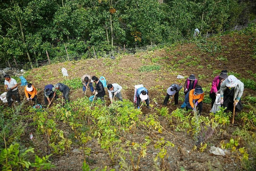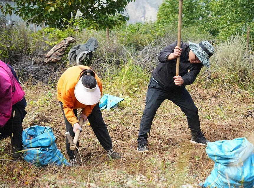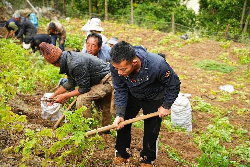 金秋十月丰收忙。10月17日,走进四川甘孜州得荣县太阳谷镇扎格村,村民们正拿着镐头在土地里忙碌着,手起镐落间,一个个新鲜的红心土豆夹带着泥土的芬芳“出土”,翻土、捡拾、装袋、搬运……村民们分工有序,现场一派热闹的丰收景象。