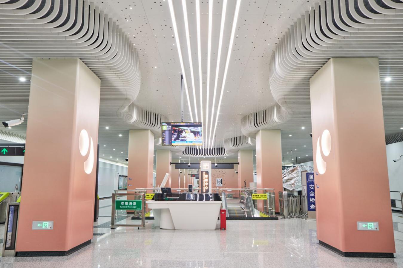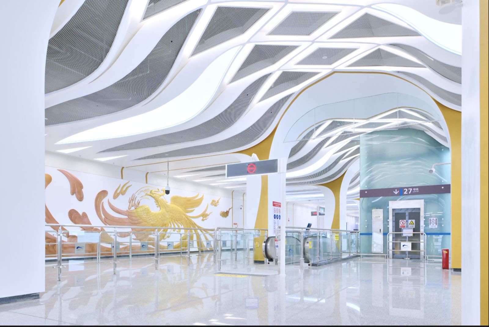 赖家店站、双水碾站两座重点艺术站设计更是匠心独运。赖家店设计巧妙运用几何线条与参数化的设计手法,将金色线条编织成生动立体的凤凰图案,充分展现凤凰展翅的动态与美感;双水碾站则以“山”和“云海”为创作核心,通过吊顶叠错的造型及发光灯膜,构造出层次分明、气势磅礴的空间装饰,创造出如梦似幻的云雾缭绕效果。
