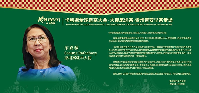 阿拉伯国家联盟驻华大使艾哈迈德·穆斯塔法·法赫米、柬埔寨驻华大使宋嘉薇、埃塞俄比亚驻华大使塔费拉·德贝·伊马姆、也门驻华使馆文化参赞默罕默德·艾哈迈迪等驻华使节对普安举办卡利姆全球选茶大会表达热情祝福,并对普安县茶产业发展致以美好祝愿。