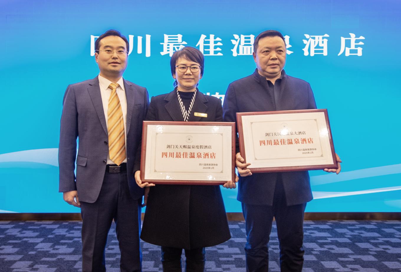 四川省温泉旅游协会向剑阁县天赐温泉度假酒店、剑门关国际温泉大酒店授予“四川最佳温泉酒店”牌匾