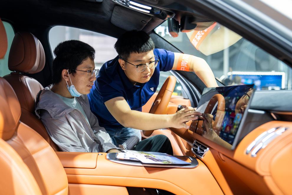 4月30日,在2025湖南汽车展览会上,工作人员(右)向观众介绍展车功能。