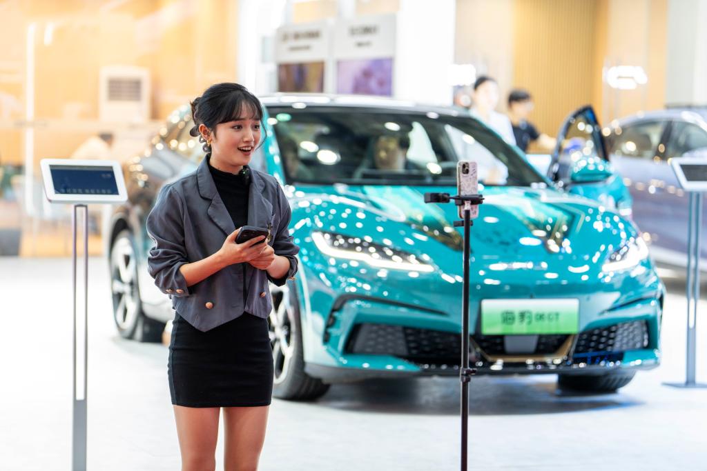 4月30日,工作人员在2025湖南汽车展览会上通过直播介绍展车。