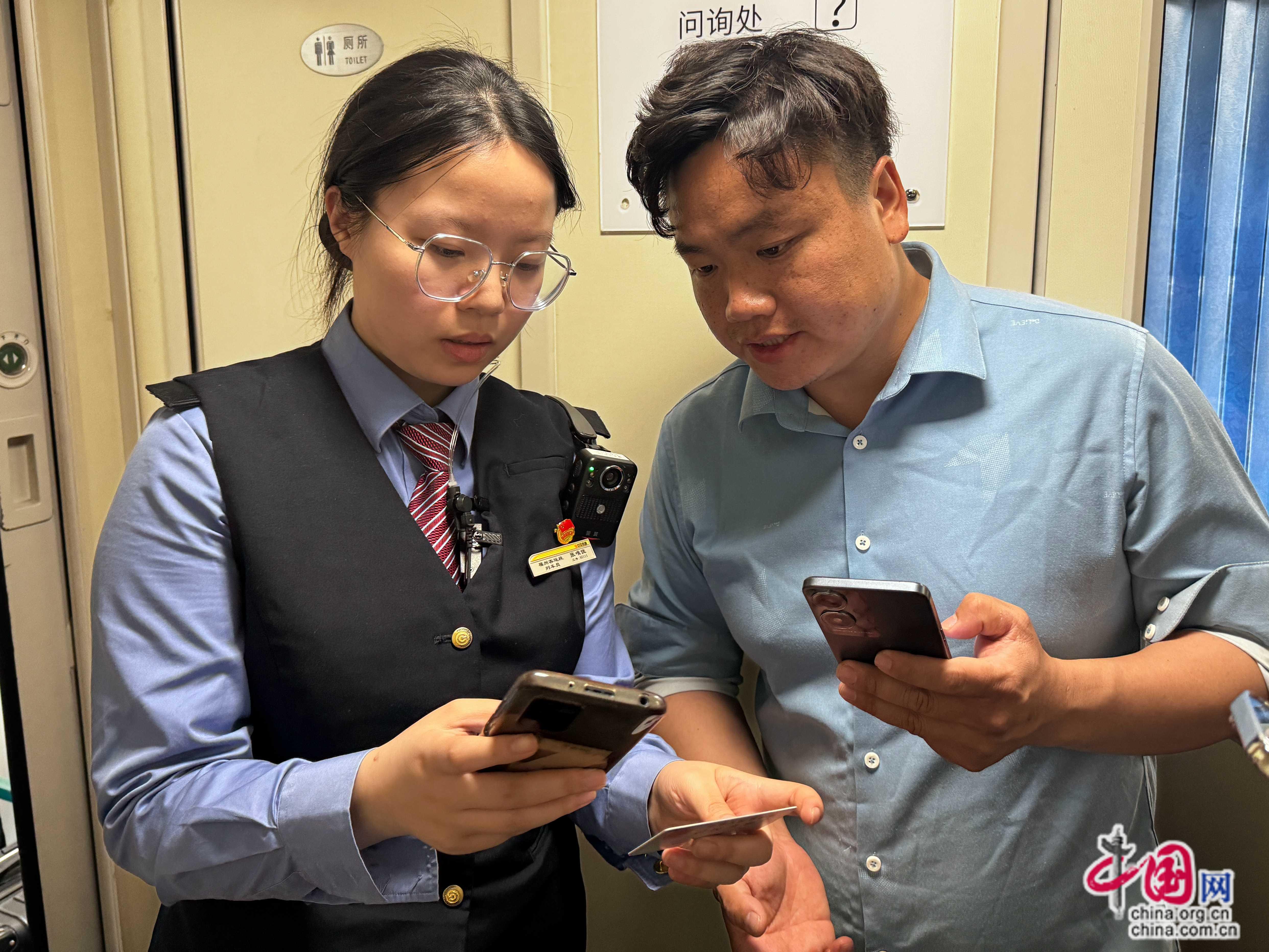 5月3日,在厦门北开往兰州Z126次列车上,乘务员正在为旅客办理补票手续