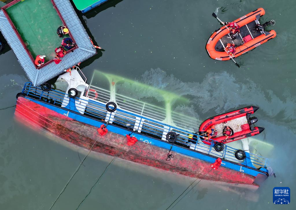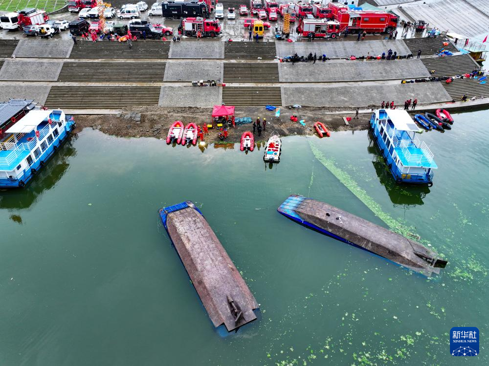 5月5日,救援人员在对倾覆船只进行搜救(无人机照片)。