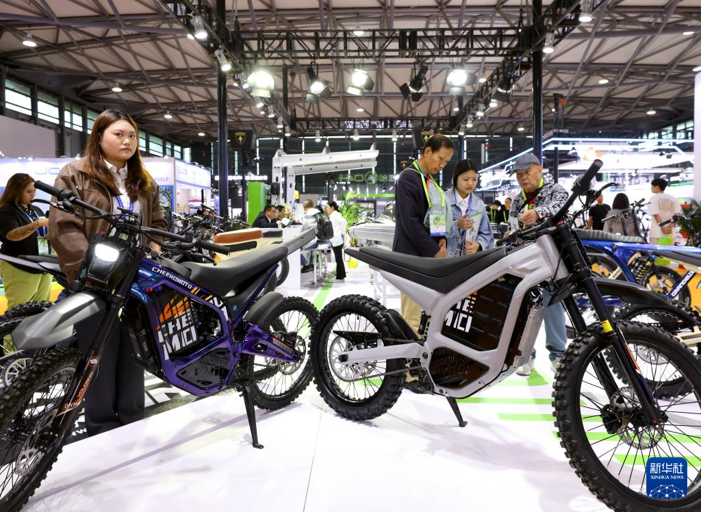 5月5日,在上海新国际博览中心举行的2025中国国际自行车展览会上,参观者在了解电动摩托车展品。