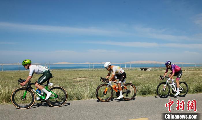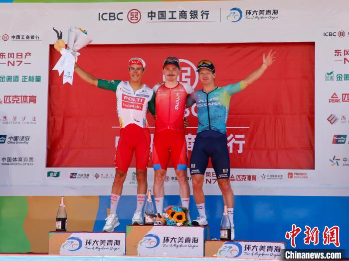 7月13日,青海省海北藏族自治州海晏县,来自李宁之星车队的谢尔比·亚历山大(中)、意大利波蒂-探索马耳他车队的佩纳维尔·曼努埃尔(左)和喜德盛-阿斯塔纳车队的盖特·艾伦·莫里分别获得赛段前三。当日,第二十四届环大美青海国际公路自行车赛迎来收官之战——同宝山绕圈赛。该赛段全程121公里,设有1个爬坡点和3个途中冲刺点。最终,来自李宁之星车队的谢尔比·亚历山大获得赛段冠军。中新社记者 马铭言 摄