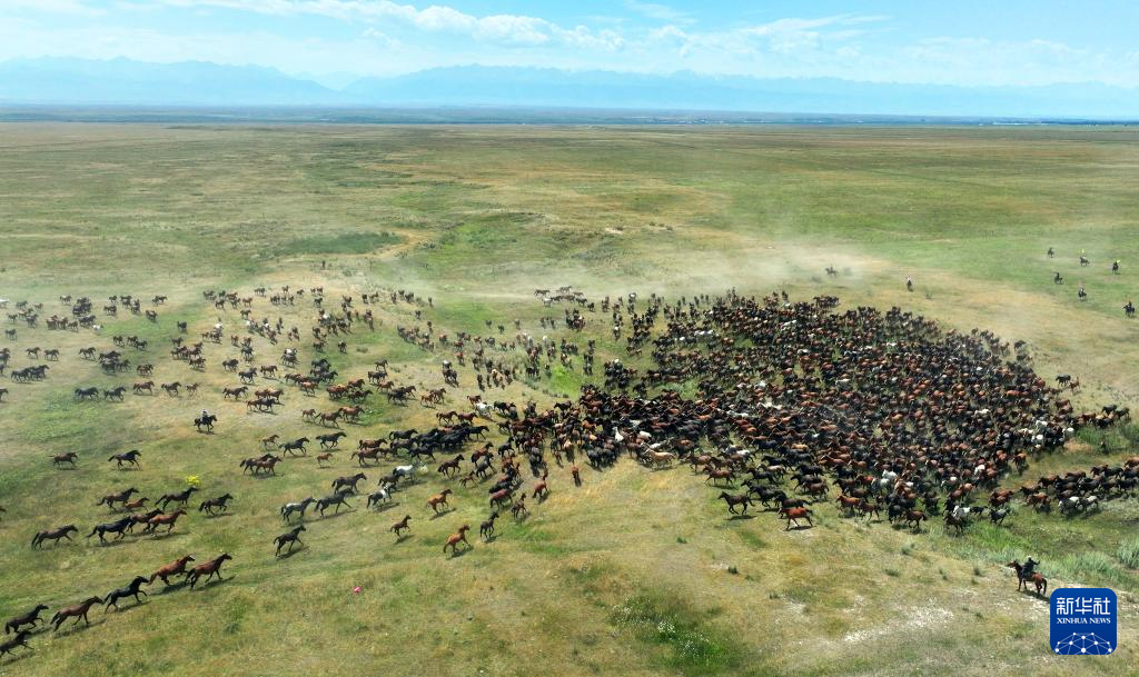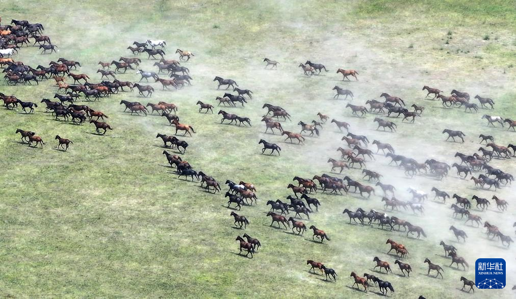 7月19日在新疆昭苏拍摄的2025新疆伊犁天马文化旅游节开幕式“万马奔腾”场景(无人机照片)。