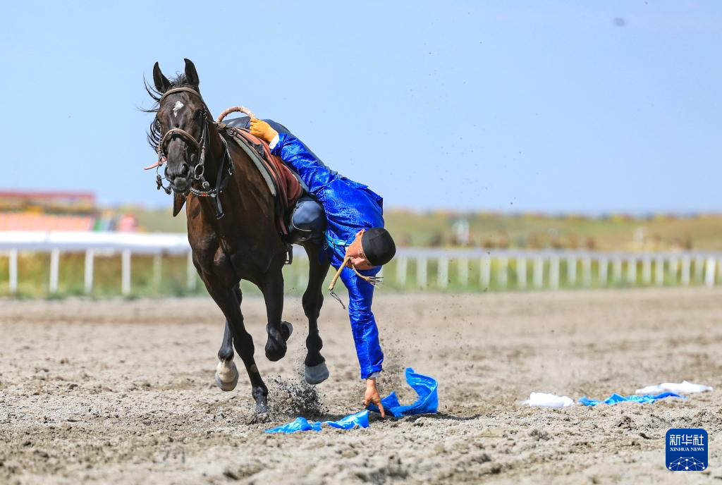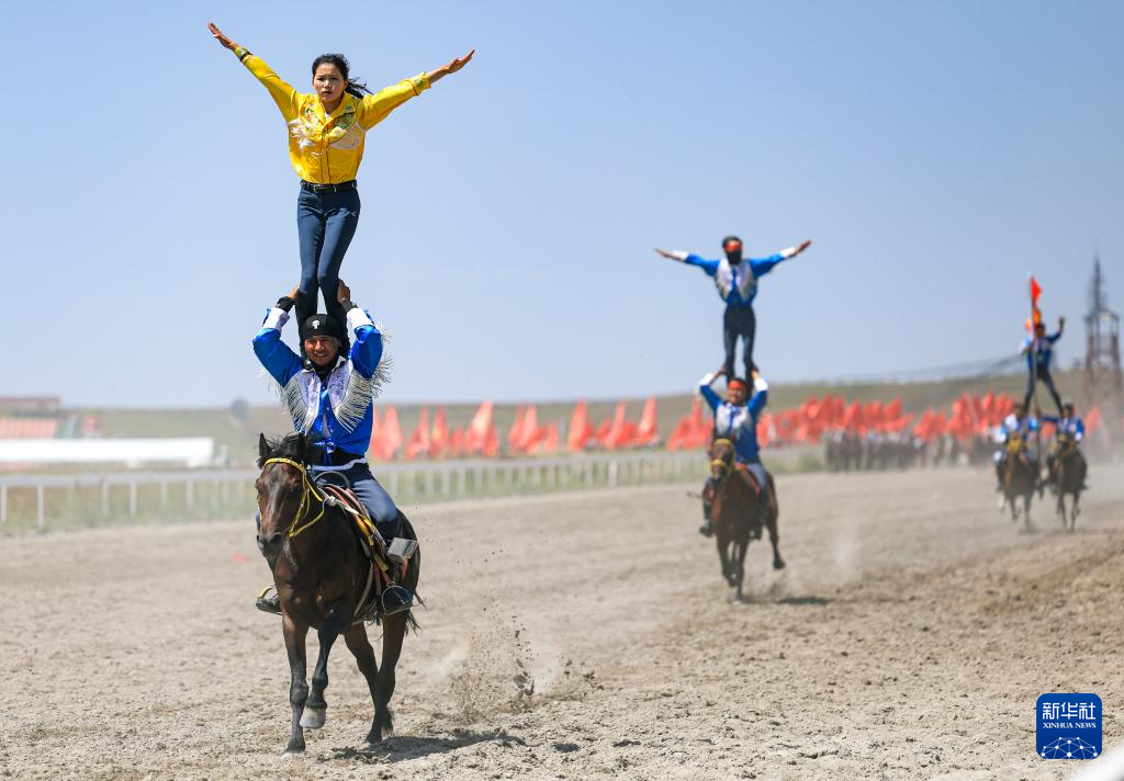 7月19日在新疆昭苏拍摄的2025新疆伊犁天马文化旅游节开幕式“马上拾银”表演。