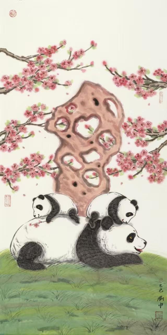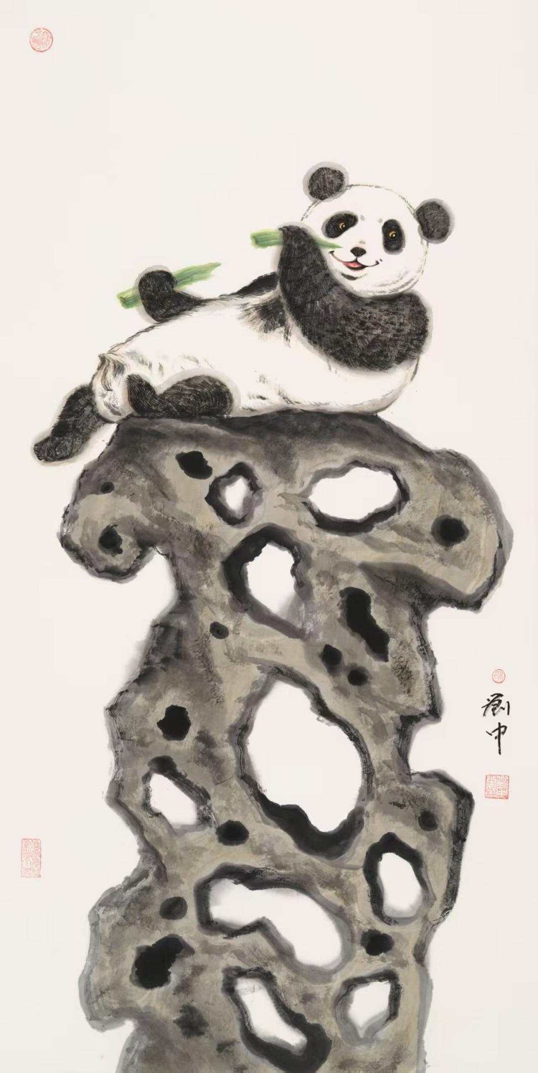 被誉为:“中国画熊猫第一人”,著名国宝画家刘中先生,此次受邀携《安如磐石》《国宝四季》两大系列共八幅精品力作举办特展。在《安如磐石》系列中,艺术家匠心独运地将国宝“熊猫中中”与太湖石巧妙结合,创作出富含文化意蕴的艺术佳作。画作中,憨态可掬的"熊猫中中"倚卧于嶙峋通透的太湖石旁,二者刚柔相济的造型既形成鲜明视觉对比,又生动诠释了中国传统"外柔内刚"的处世哲学。太湖石"皱、漏、瘦、透"的审美特质自古被视为文人风骨的象征,其坚固质地更暗含"坚如磐石"的永恒意境;而作为和平使者的大熊猫,其温润形象则传递出和谐共生的东方智慧。值此香港回归28周年之际,这一艺术组合被赋予更深层寓意:太湖石的沉稳坚毅象征着"一国两制"方针的稳固根基,"熊猫中中"的从容姿态则寄托着对香港繁荣安定的美好期许。作品通过传统美学语言,既展现中华文化的深厚底蕴,又传达出对香港长治久安的真诚祝愿——如太湖石般历经风霜而岿然不动,似大熊猫般在祖国怀抱中生生不息,这正是对"安如磐石"主题最生动的艺术诠释。