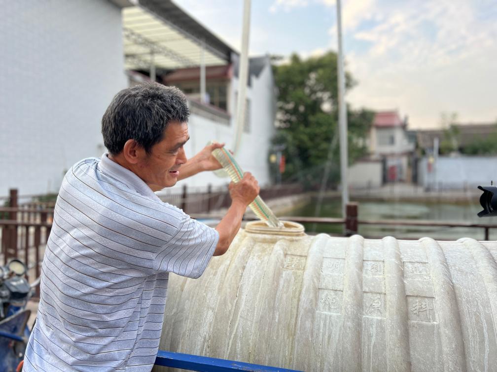 卫有安在池塘边打水。新华社记者马晓洁 摄